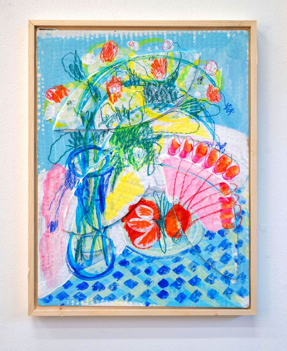'Still life with checkered towel', acrylic, gouache, crayon and collaged card on card. 27,5 x 35 cm. Framed in handmade wooden frame, without glass. Signed and dated on the back.